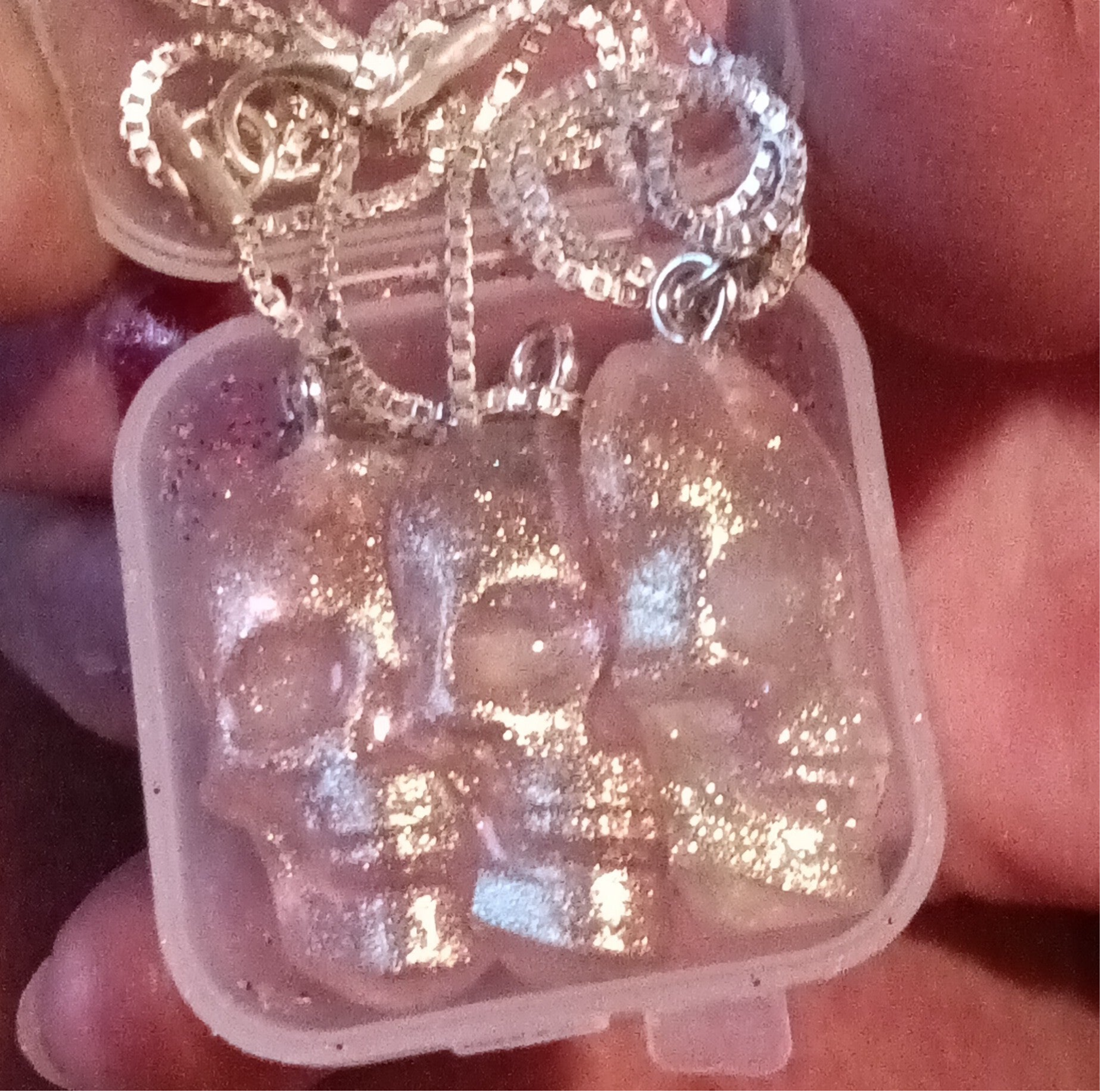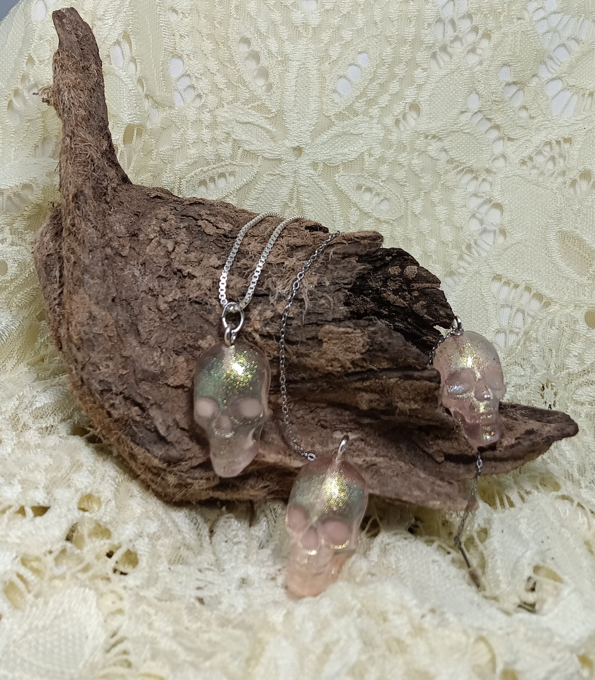 Born of moonlight and mystique, this set evokes the spirit of a modern-day goddess—fierce, feminine, and utterly unforgettable. A translucent pastel pink skull glows atop a 925 sterling silver 18-inch chain, its soft hue cloaking a powerful presence. Each matching thread-through earring sways like enchanted charms on silver strands, whispering secrets as they move.