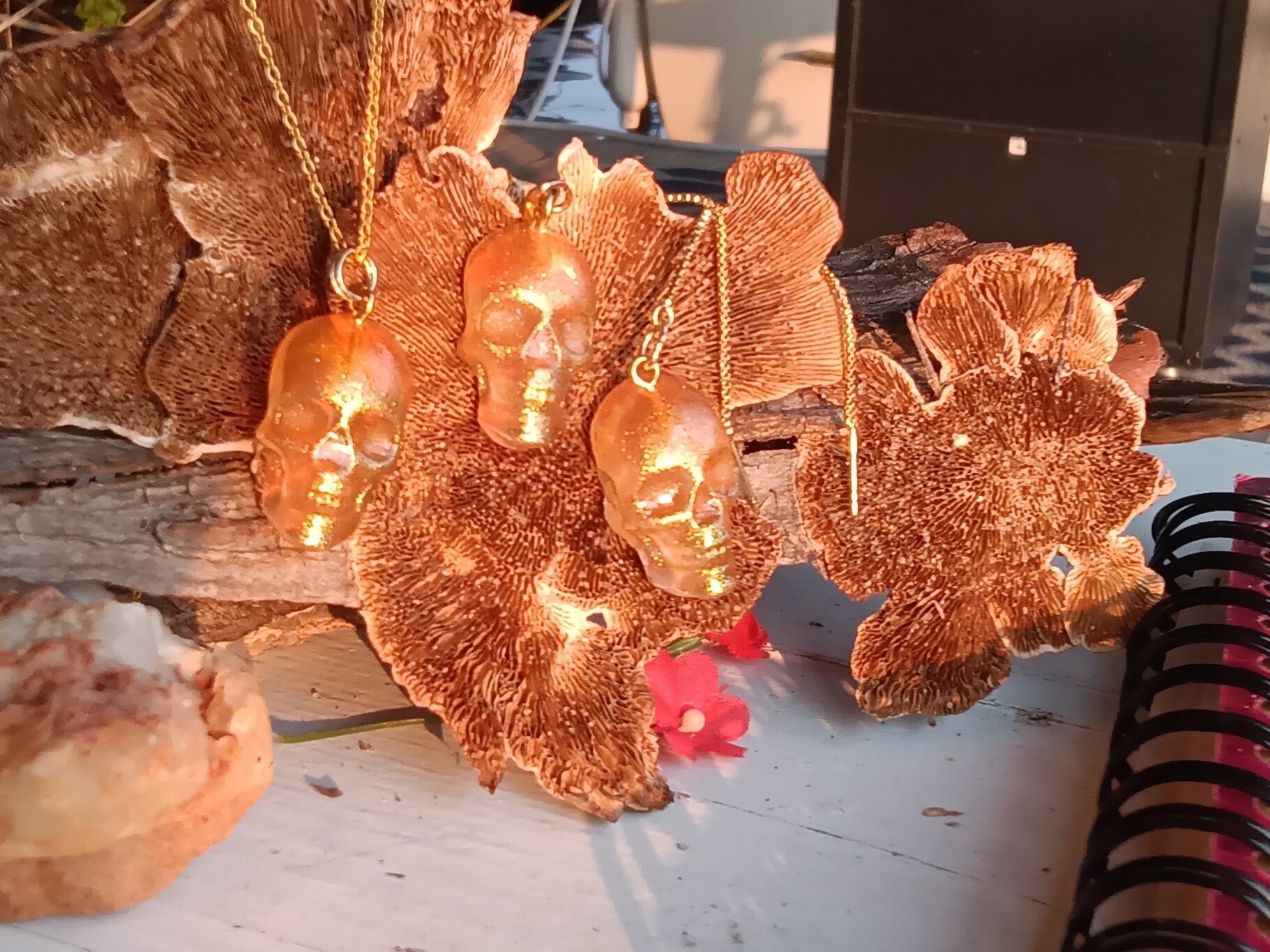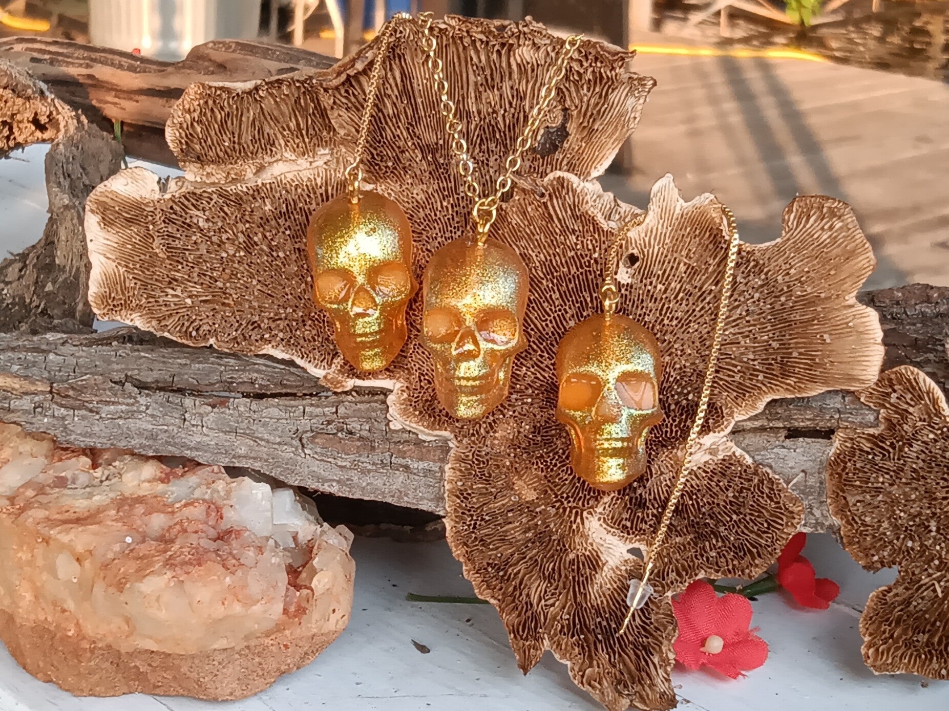 First up is golden tangerine sporting an 18inch `18kt gold pl chain and the matching earrings 4 inch thread through chains